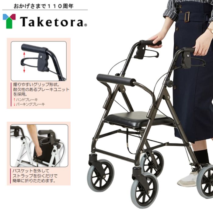 【送料無料】【竹虎】ハッピーミニ 軽量 コンパクト 安定 小回り 室内外 おしゃれ バスケット 取り外し可能 SGマーク 座面 座れる 介護 介助 散歩 リハビリ 折りたたみ ブレーキ 920086