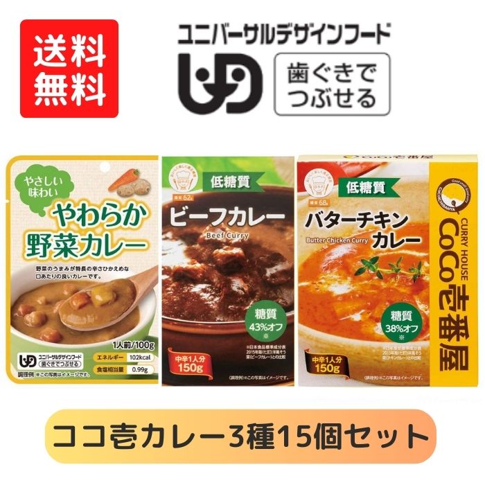 【送料無料】【株式会社壱番屋】CoCo壱番屋 やわらか野菜カレー 589501 低糖質ビーフカレー 589502 低糖質バターチキンカレー 589503 3種15個セット 区分2 介護食 食事 簡単 ユニバーサルデザインフード 高齢者 やわらかい 食べやすい