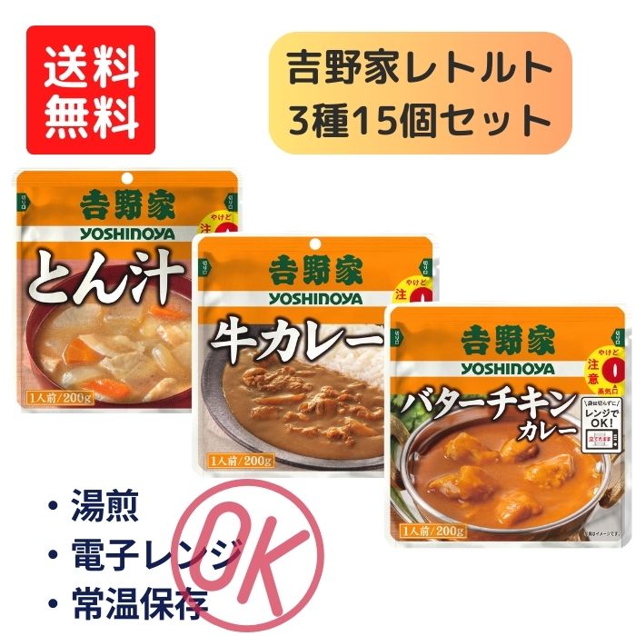 【吉野家】レトルトシリーズ 3種15個セット とん汁 834606 牛カレー 834607 バターチキンカレー 834608 介護食 やわらか食 硬いものが食べづらい方にも 食事 簡単 豚汁 カレー 栄養 食べやすい やわらかい 高齢者 電子レンジ 湯煎 常温保存 可