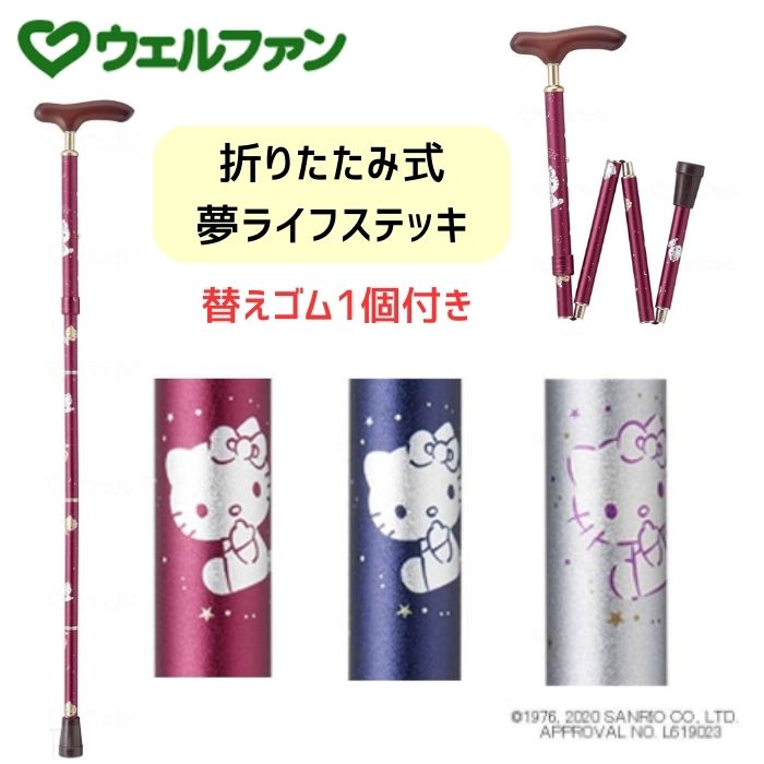 【送料無料】ウェルファン 夢ライフステッキ スリムネック ハローキティ SGマーク付き 可愛い 杖 つえ ステッキ 散歩 折りたたみ 替えゴム付 コンパクト キャラクター かわいい おしゃれ 010102(camcode-3372)