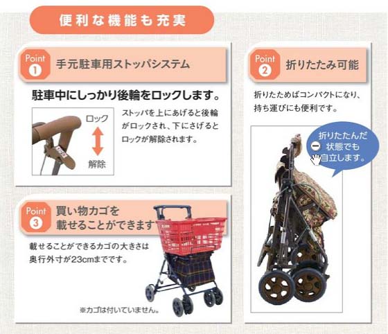 コンパクト設計ながらも大収納力、買い物カゴを載せることもできるシルバーカーです。 |