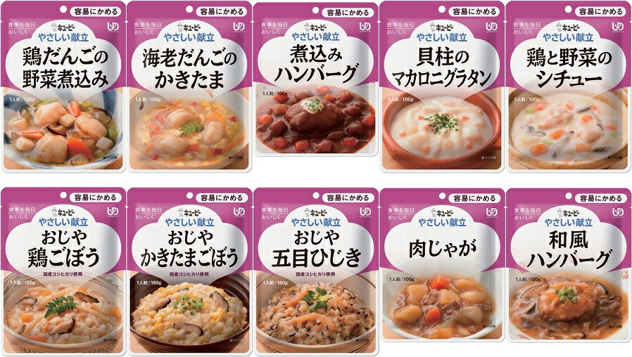 | 種類 | Y1-4:鶏だんごの野菜煮込み Y1-6:海老だんごのかきたま Y1-8:煮込みハンバーグ Y1-10:貝柱のマカロニグラタン Y1-14:鶏と野菜のシチュー Y1-19:肉じゃが |