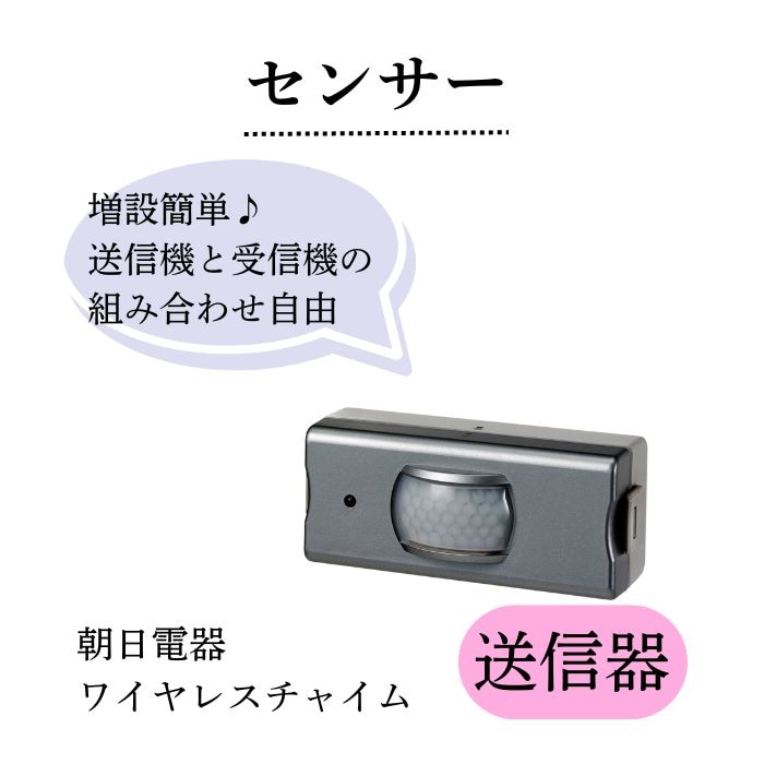 | その他商品説明 | ●電波の到達見通し約120m ●IDコードが25万通りなので混信の心配がありません ●配線が不要なワイヤレスタイプなので設置が簡単!用途に合わせて送信器・受信器の増設も可能です(1台の受信器に対して8台までの送信器を登録して使用できます) 用途に合わせて選べる! ~【朝日電器】ワイヤレスチャイムシリーズ~ お部屋からの呼び出しに 【送信器】 ドアが開いたら呼び出し センサーが反応すると呼び出し お風呂やトイレからの呼び出しに 【受信機】 8種類の音でお知らせ 8種類の音とランプでお知らせ |